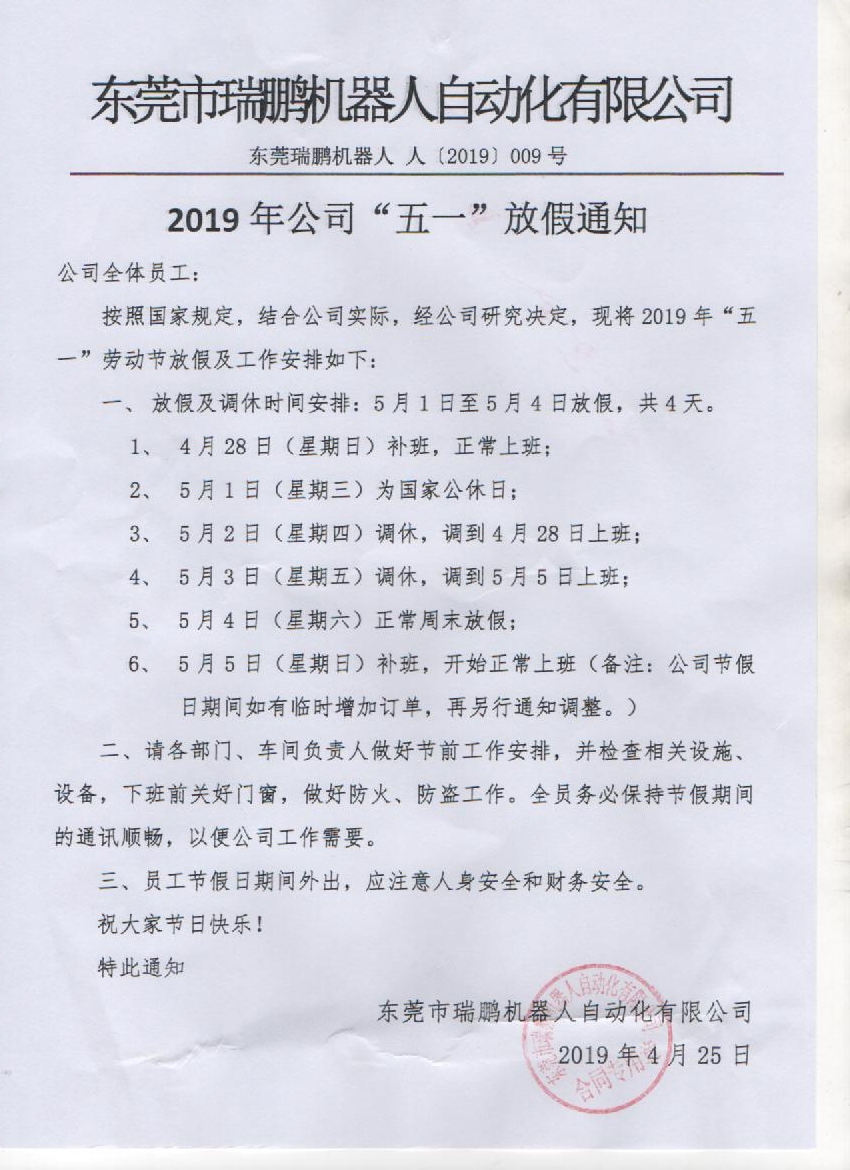 按照國家規(guī)定,結(jié)合公司實際,經(jīng)公司高層探討決定,2019年“五一”勞動節(jié)放假時間為:5.1-5.4放假四天,4月28號,5月5號正常上班。